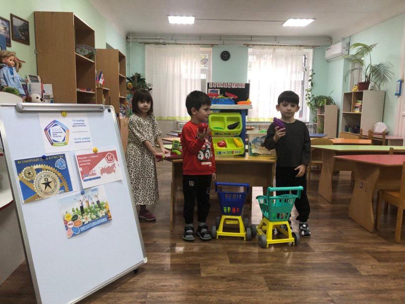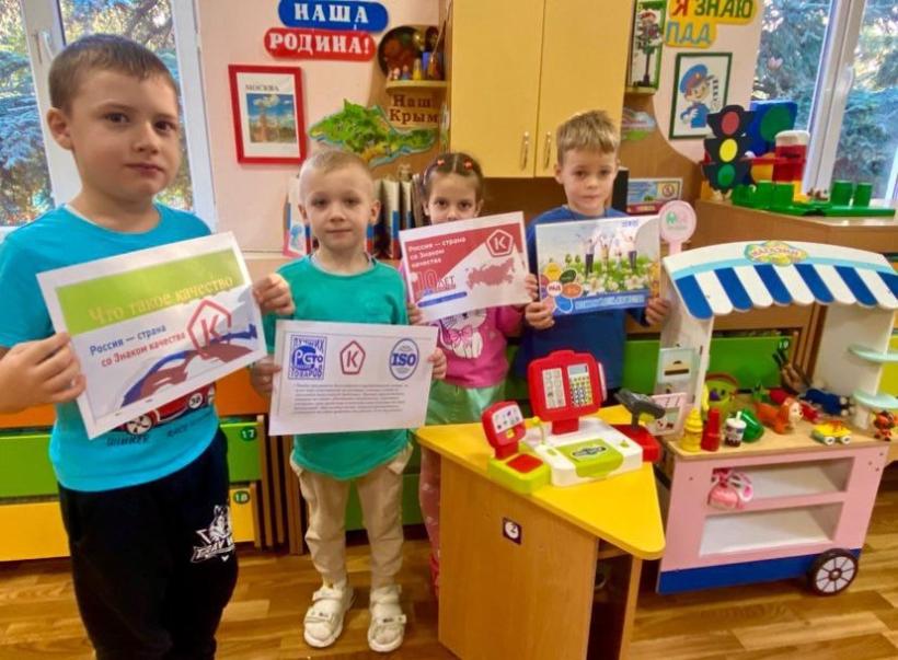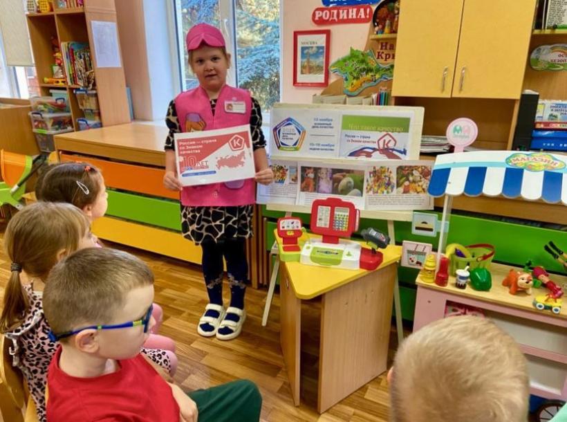 В ходе мероприятий ребята узнали о важности качества товаров, продуктов и услуг. Что такое Знак качества и как он помогает потребителям выбирать лучшее. Была показана презентация с наглядными примерами качественных российских товаров. После просмотра дети с интересом поиграли в дидактические и сюжетно-ролевые игры "Магазин", "Супермаркет" и нарисовали свои собственные Знаки качества.