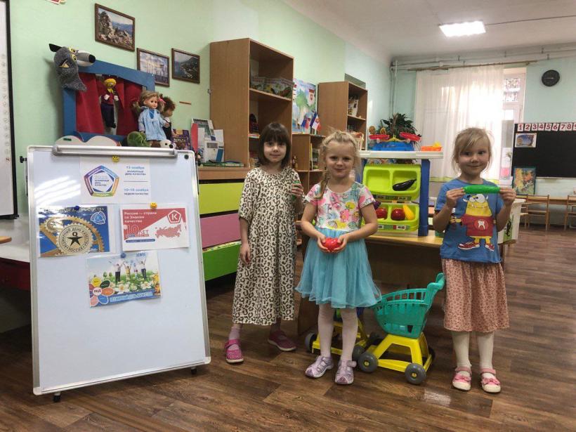 С воспитанниками старших и подготовительных групп прошли такие мероприятия : тематические занятия, посвященные Дню качества под девизом "Россия - страна со Знаком качества"